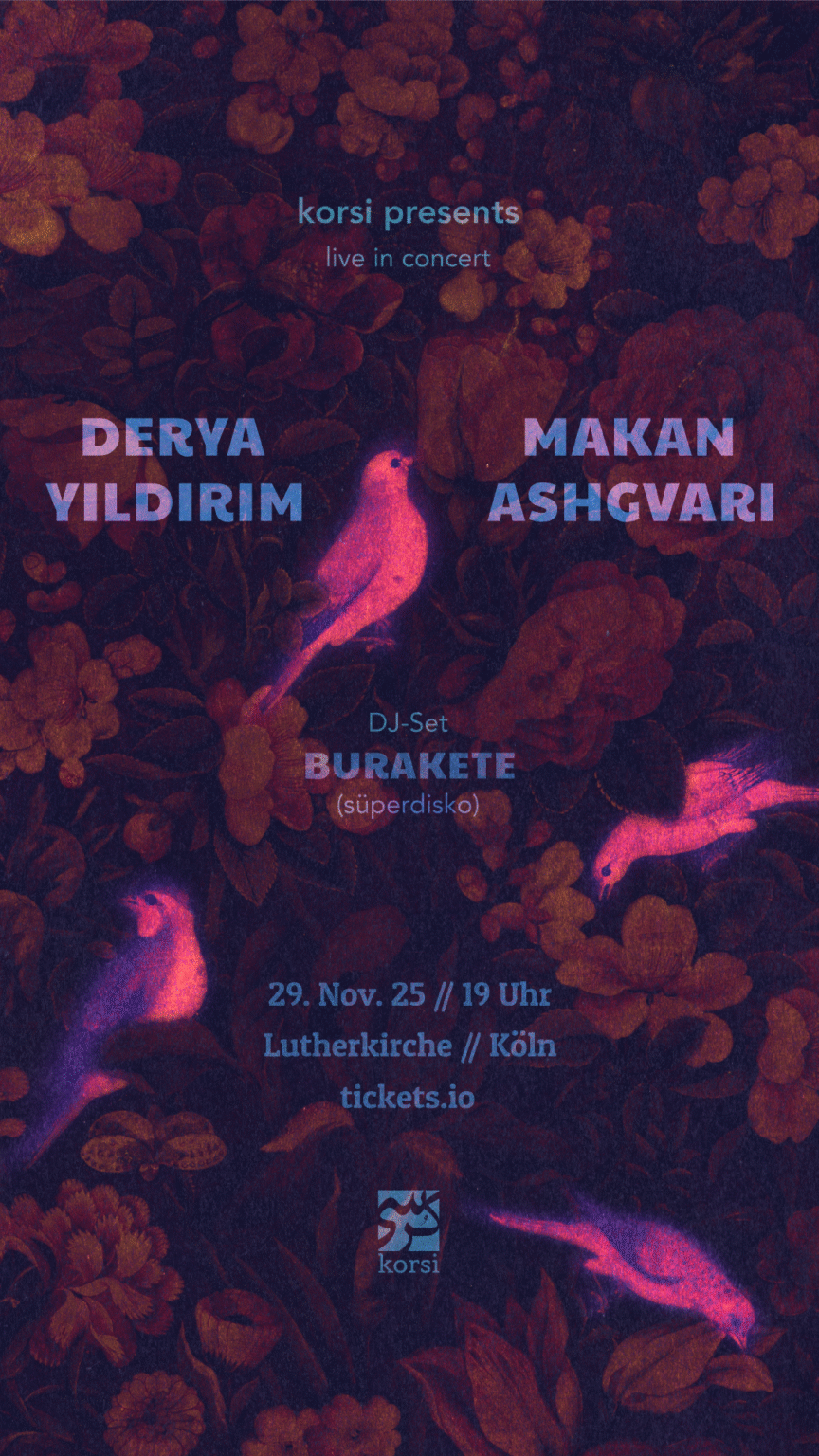 Korsi invites all curious listeners to an evening where music travels between places, memories, and voices. Two solo performances by Derya Yıldırım and Makan Ashgvari explore how tradition and experiment can coexist — blending heritage, emotion, and innovation in a shared space.